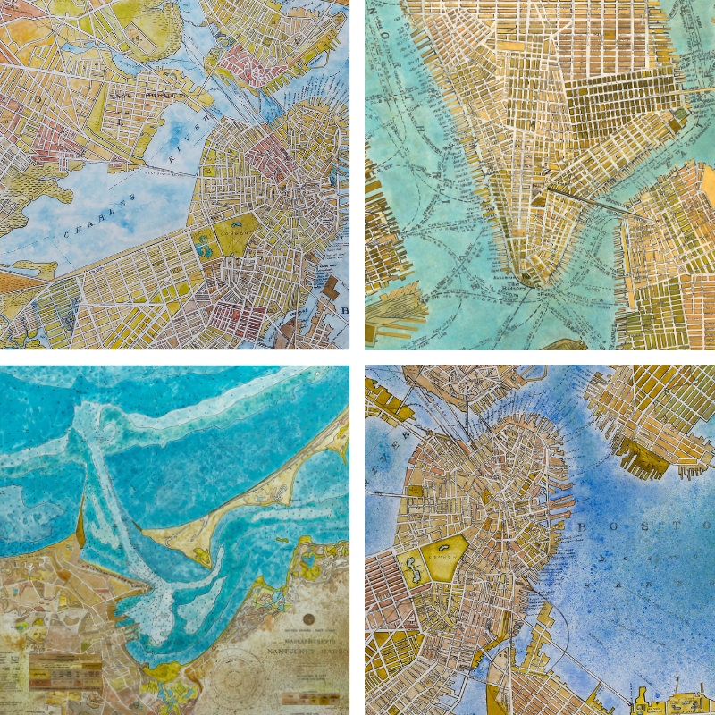 Seth’s map collection brings geographic elegance into artistic focus.
